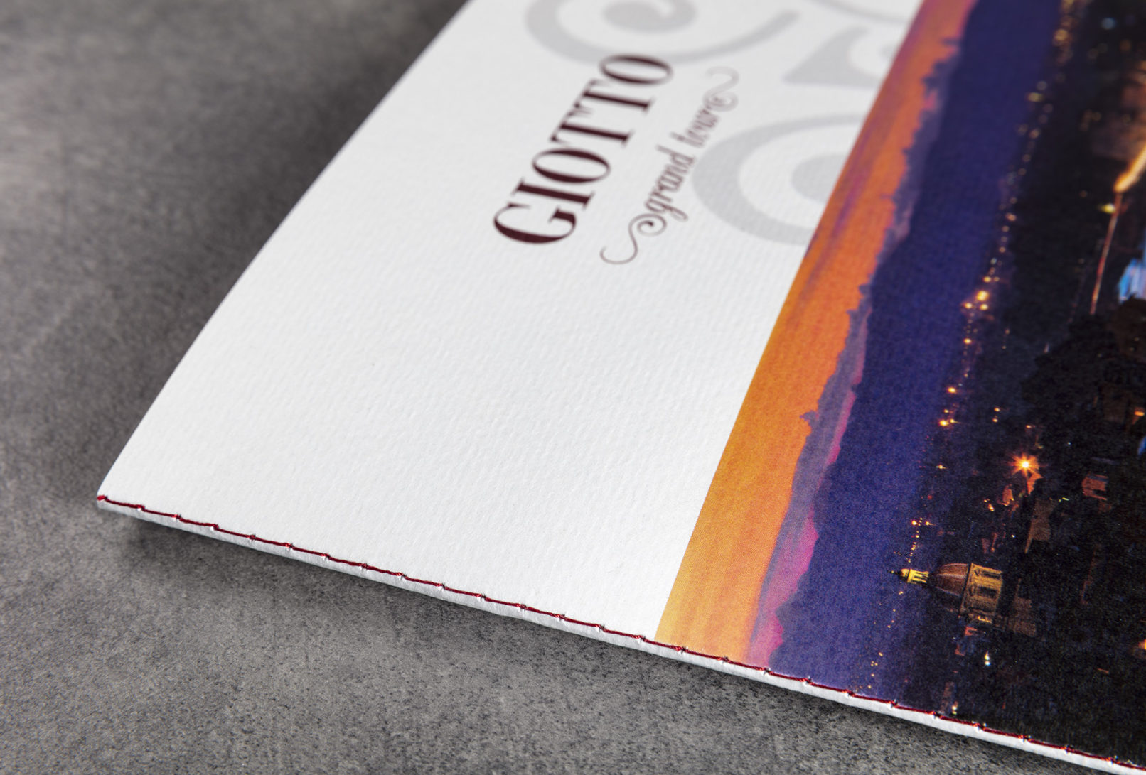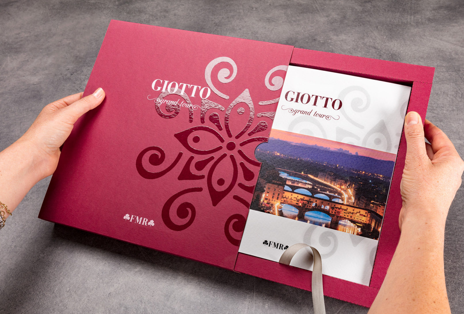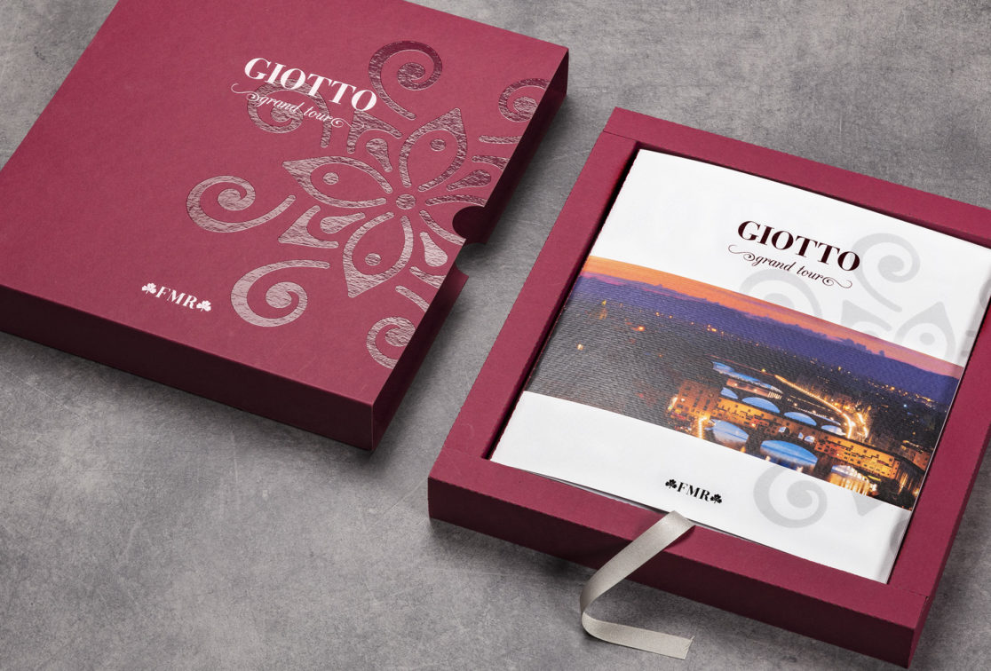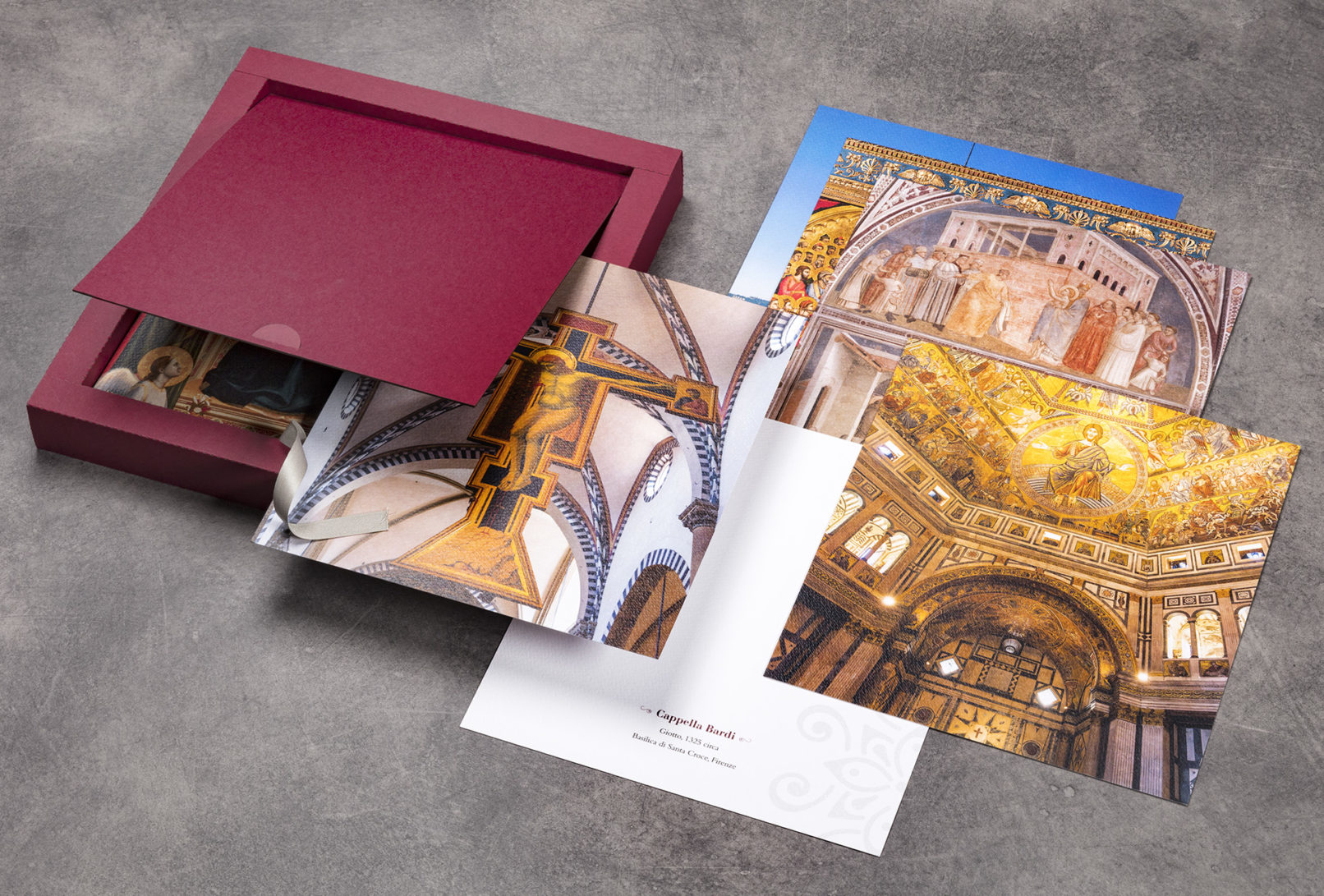 La presentazione e la vendita avviene con un cofanetto cartotecnico impreziosito dalla estrema cura della stampa e dei particolarità tecniche: stampa serigrafica con verniciature, rilegatura a filo con stesso colore del cofanetto. Al suo interno alloggiamento della brochure di presentazione e delle schede opere di Giotto su due livelli.