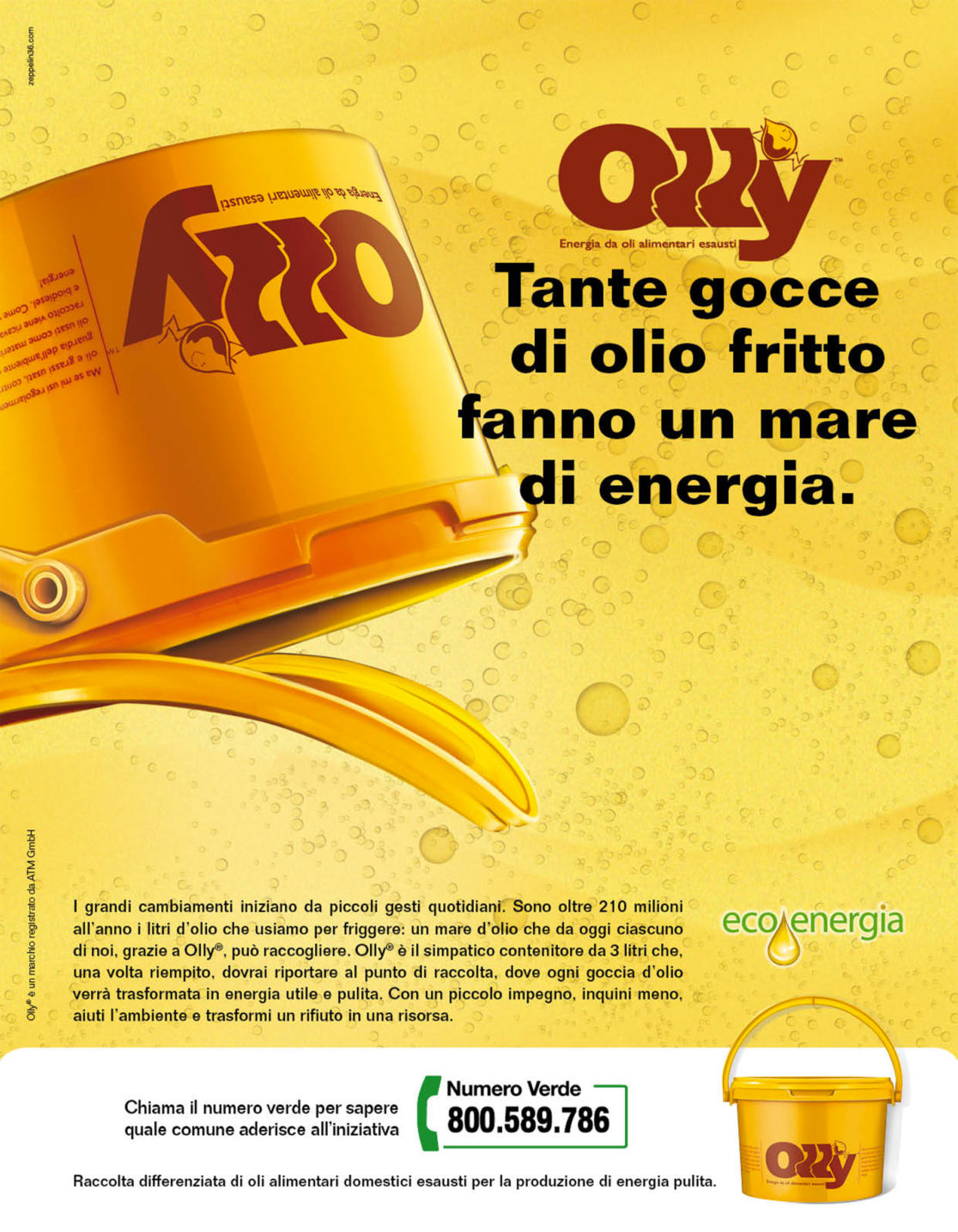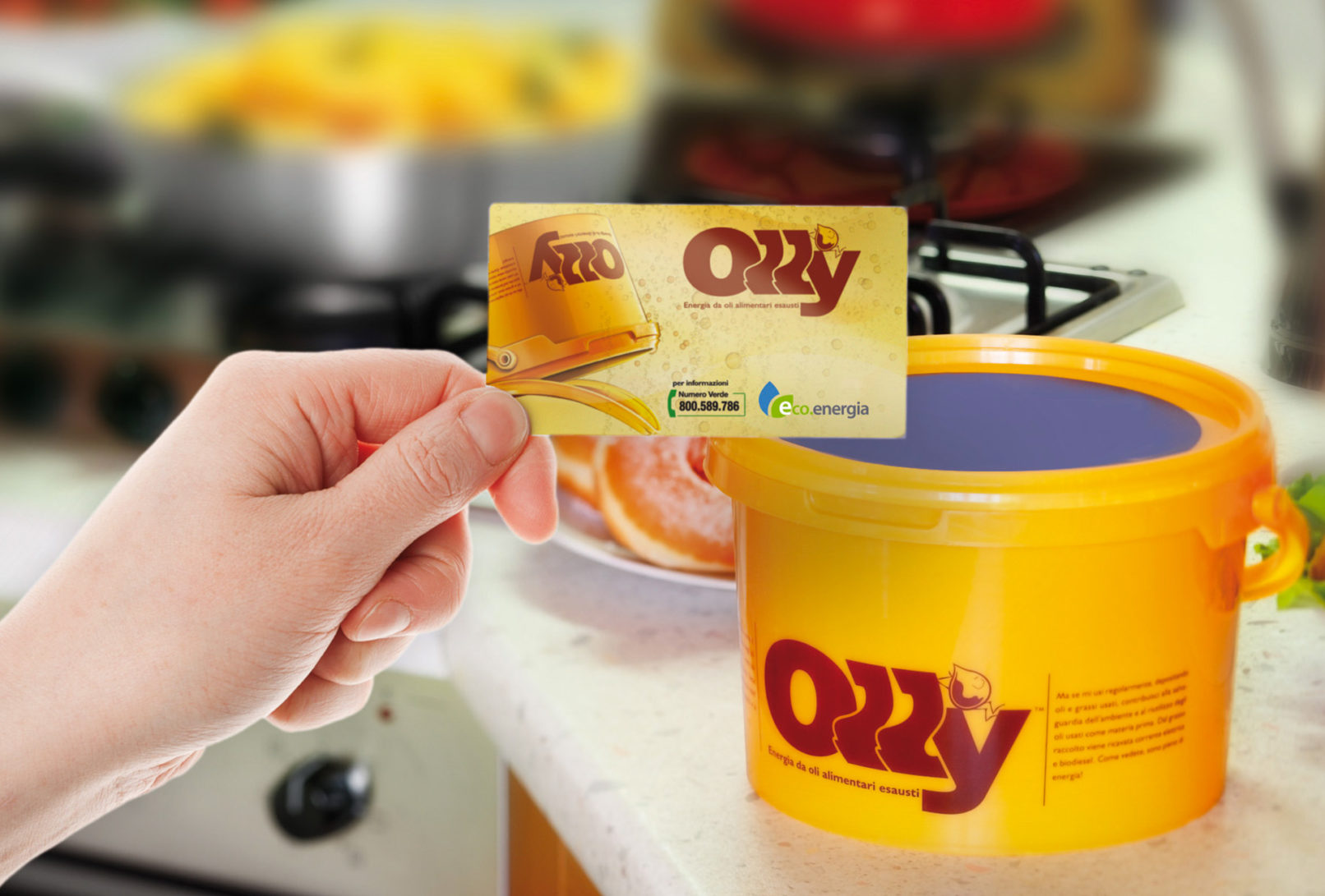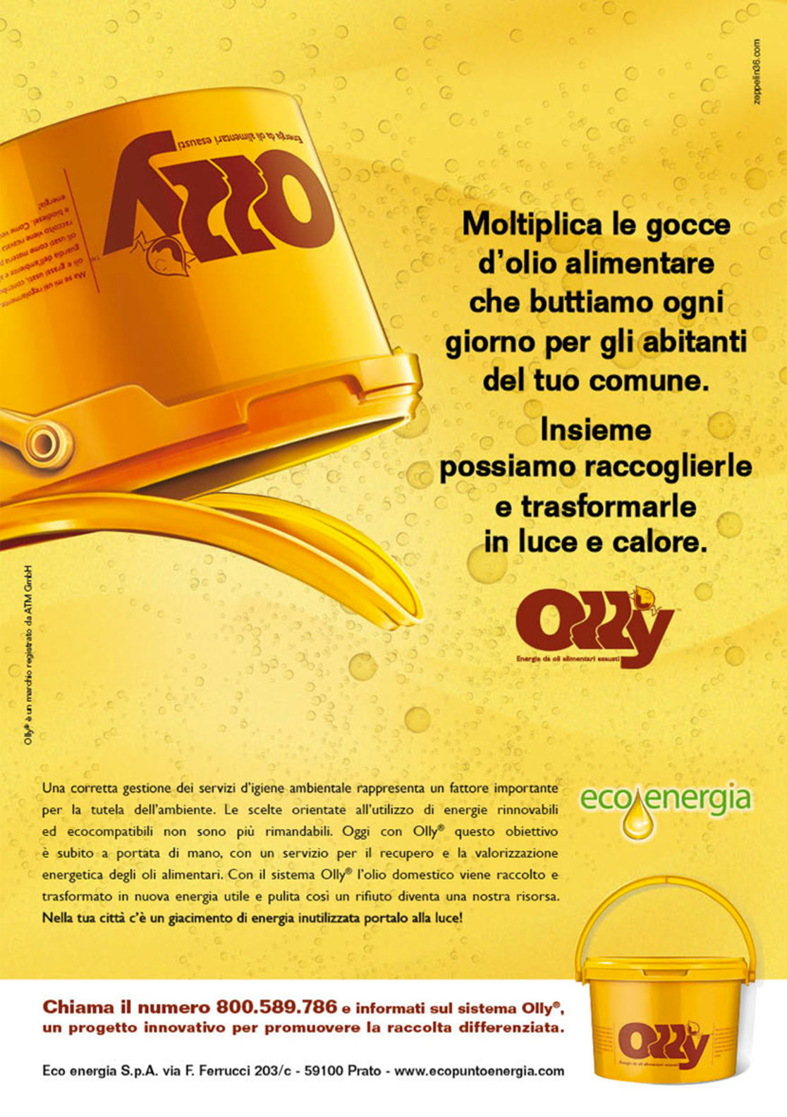 Eco.Energia è intestataria per l’Italia del marchio Olly, il più innovativo sistema di raccolta degli oli alimentari sia di origine domestica che per la ristorazione. Olly è un servizio che preserva l’ambiente e trasforma un rifiuto in risorsa, raccogliendo l’olio esausto nell’apposito bidoncino giallo. Eco.Energia provvede al ritiro dei bidoncini occupandosi della produzione del rifiuto fino al suo avvio al recupero.