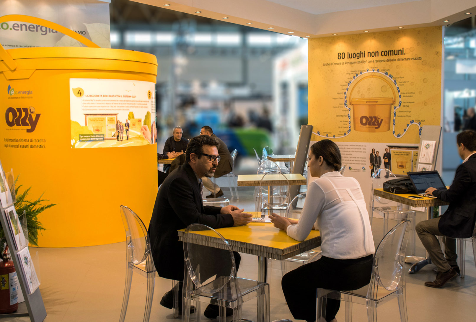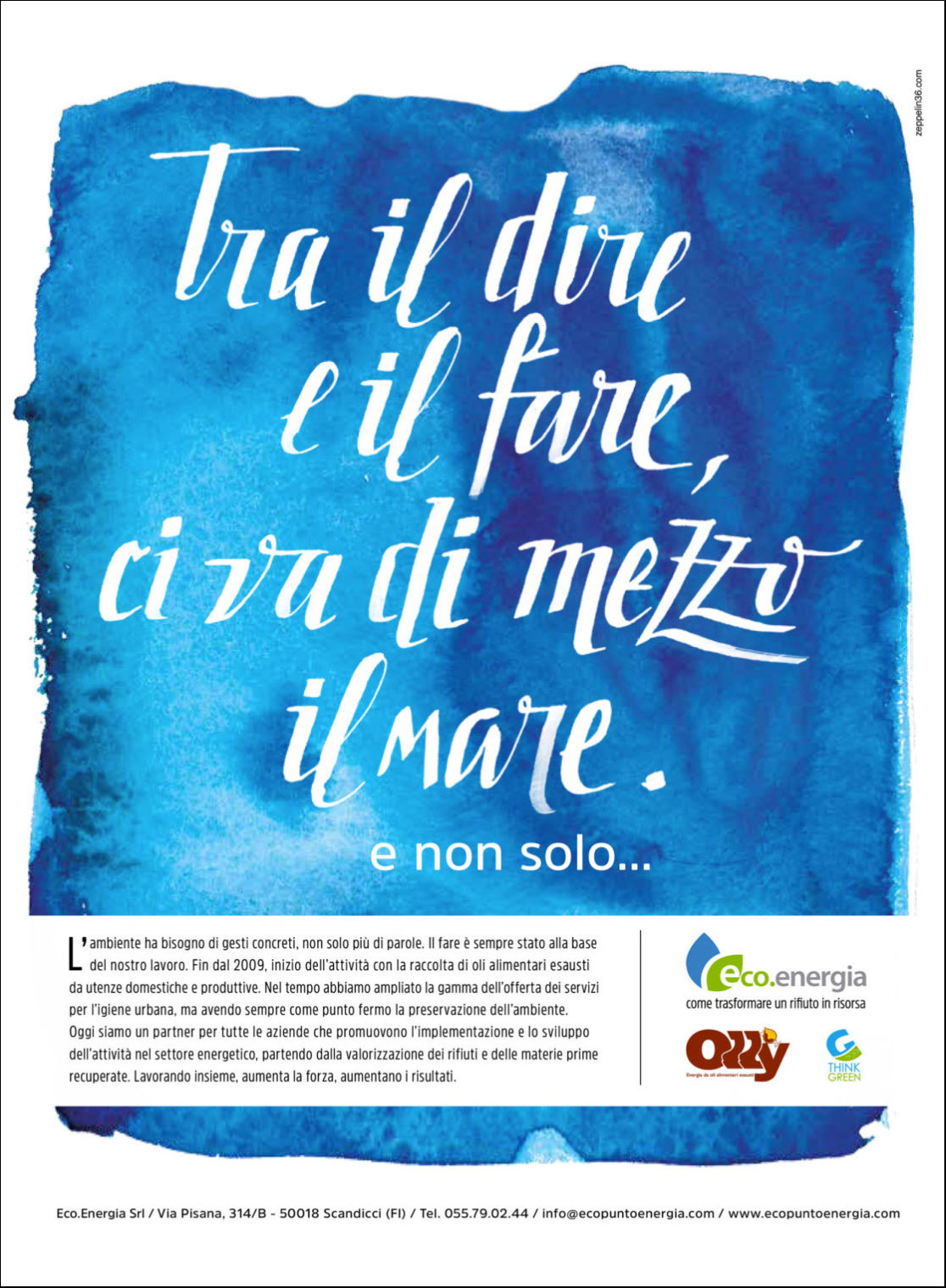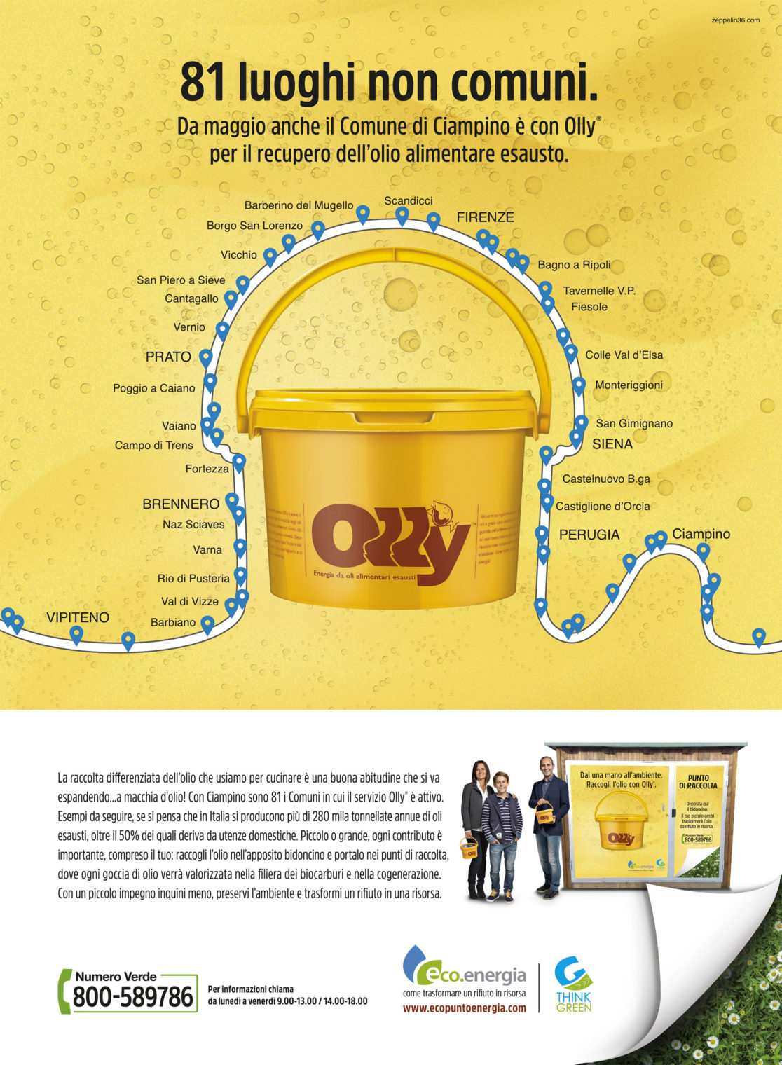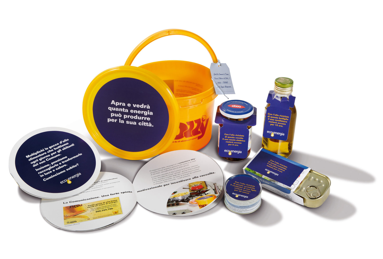 Logo istituzionale e immagine coordinata. Campagna Adv istituzionale Eco.Energia. Lancio servizio Olly con campagne Adv, affissioni, conferenze stampa con enti pubblici. Studio creativo materiale divulgativo presso centri commerciali e scuole. Operazioni di “Guerrilla Marketing”. Campagne pubblicitarie sul territorio, rivolte ad informare il pubblico di un nuovo punto di raccolta. Creazione stand per Ecomondo, video istituzionale, abbigliaggio mezzi. Creazione e produzione gadget.