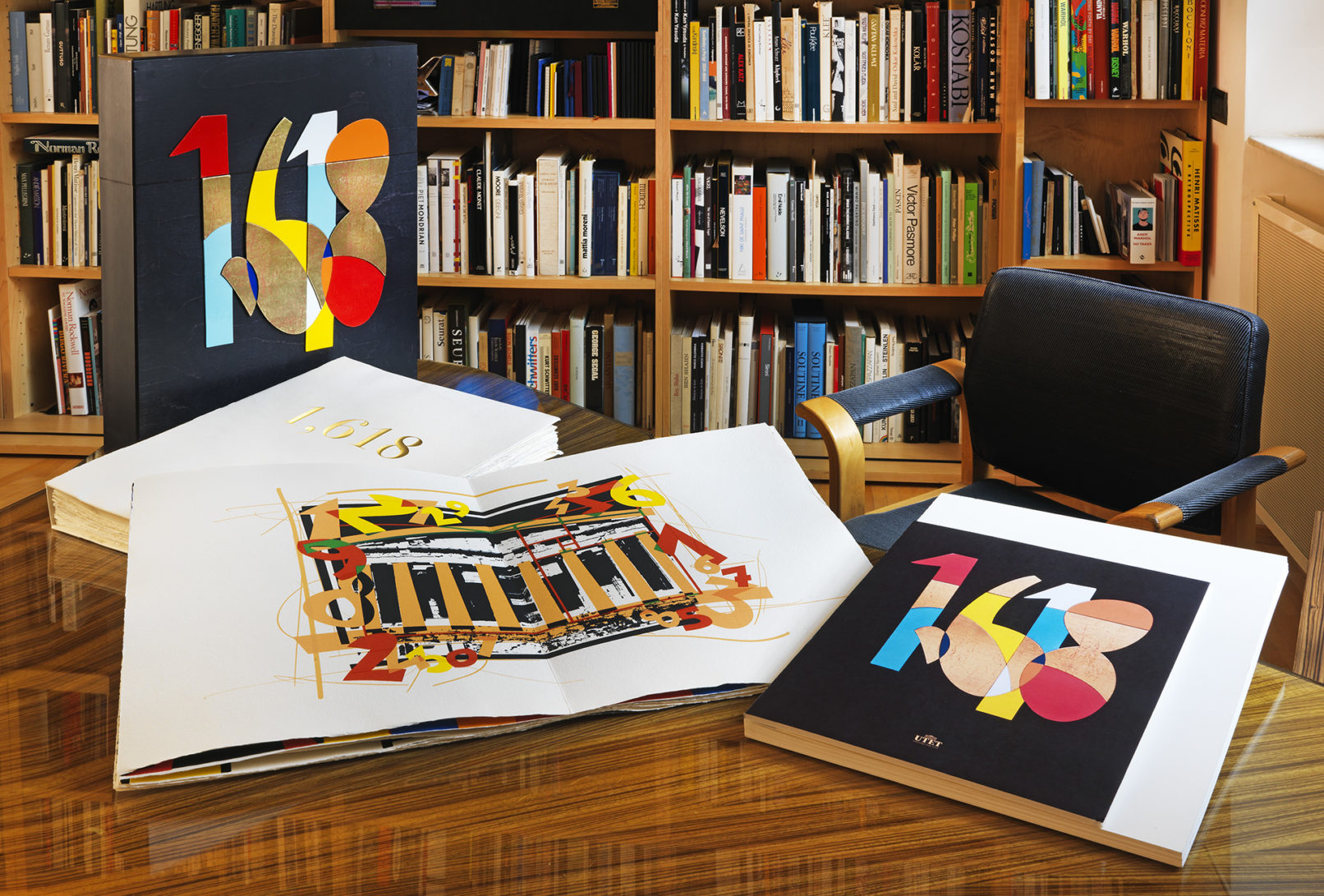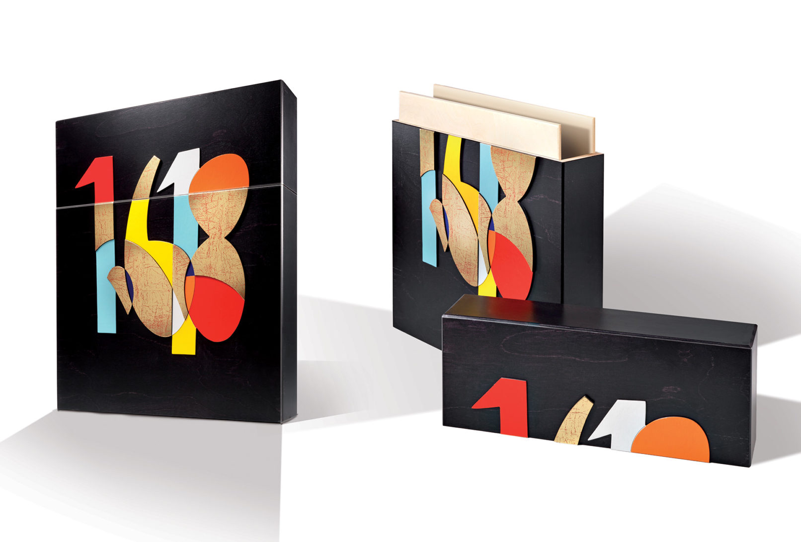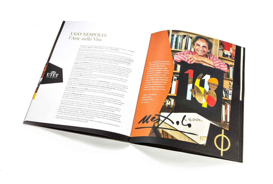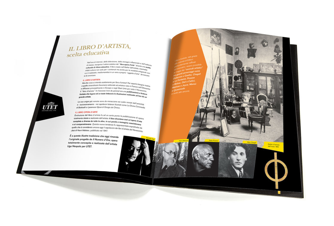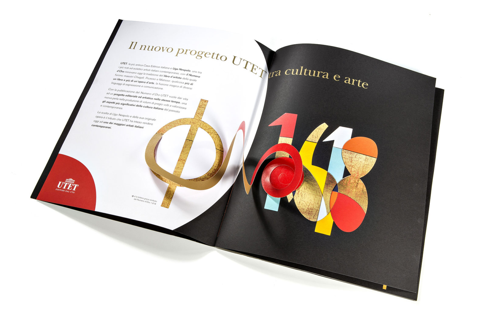 Studio per immagine volume d’Artista “1,618 il Numero d’Oro”. Folder di grande formato con inserimento elementi in pop-up. Cofanetto in legno laccato con inserti a foglia d’oro e colori smaltati. Catalogo mostra e materiali vari comunicazione per presentazione volume a cura di Ugo Nespolo e Piergiorgio Odifreddi.